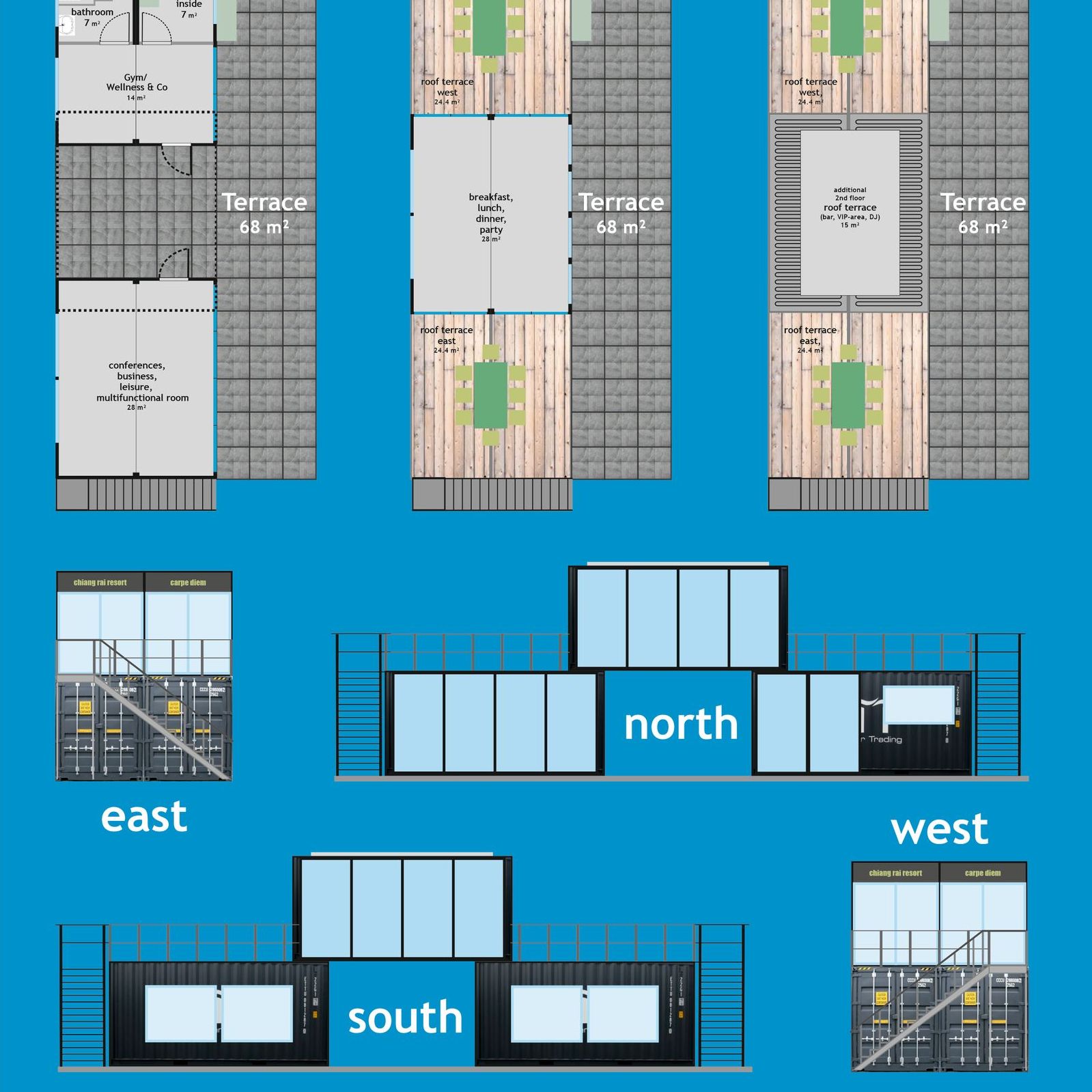 The roof terrace can be reached by a 21-step, 1 m wide steel staircase with an intermediate level after 14 steps. The size of the roof terrace is 82 m² (8.8 x 9.3 m) and is equipped with a circumferential steel railing (91 cm height) at a distance of 50 cm from the edge of the roof, thus providing 68 m² of usable smooth concrete surface (exposed concrete look).